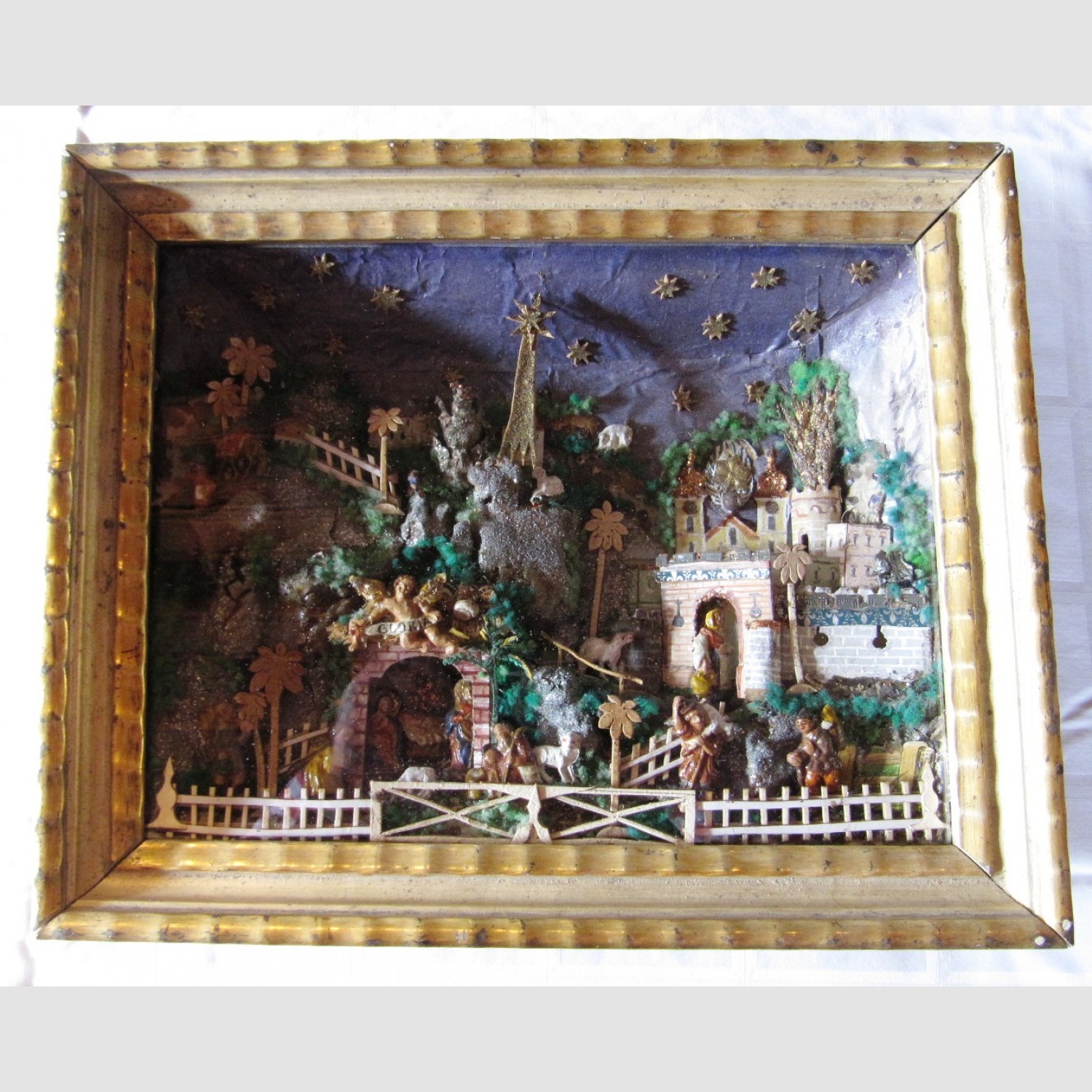 Biedermeier Krippe 19. Jahrhundert Lehmfiguren Holzrahmen Weihnachten